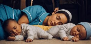 На мягком ковре, под мягким светом люстры, спала домработница в нежно-голубой форме. Вокруг неё свернулись два младенца, близнецы, ещё не достигшие полугода. Один сжимал её палец маленькой ручкой, другой уютно устроился на груди, слушая тихое биение сердца женщины.