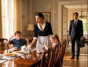 Подойдя к столовой, Адриан остановился на пороге. За столом сидели Итан и Лили, заляпанные кремом и мукой, а рядом — Роза в зелёной униформе. На столе — свежий шоколадный торт, украшенный ягодами. Роза разрезала его на щедрые куски, а дети хлопали в ладоши. Комната дышала счастьем.