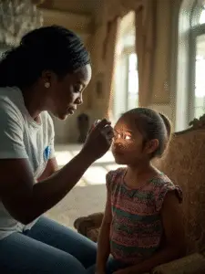 Вечером они вернулись домой, и Луна захотела показать свои способности внутри квартиры. Она проводила рукой по свету, падающему через окна, описывая оттенки и текстуры. На каждом предмете — лампах, шторах, мебели — она видела истории. Каждый отблеск и тень рассказывали ей нечто уникальное.