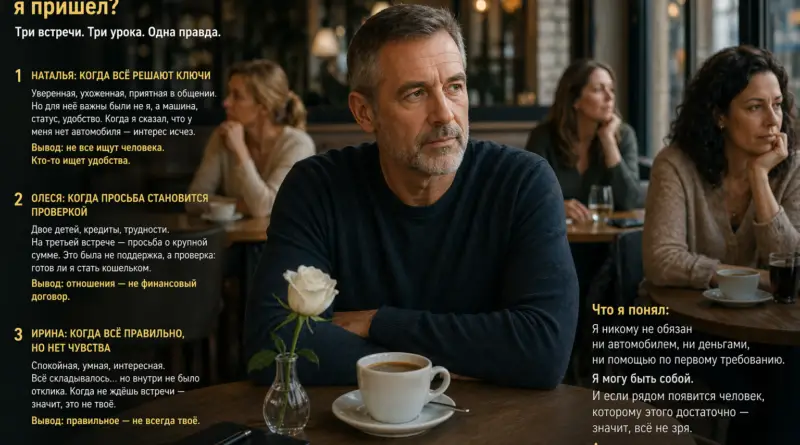 После этого атмосфера изменилась. Разговор стал крутиться вокруг удобства, статуса, ожиданий. Я понял: для неё важен не человек, а атрибуты.
