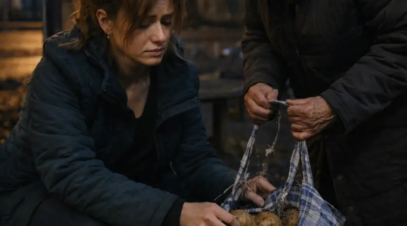 Под тусклым фонарём остановки, прямо в лужу, выкатывались крупные картофелины. Рядом стояла невысокая пожилая женщина в объемном сером пуховике и тёмном платке. Она растерянно смотрела на разорванные ручки клетчатой сумки.