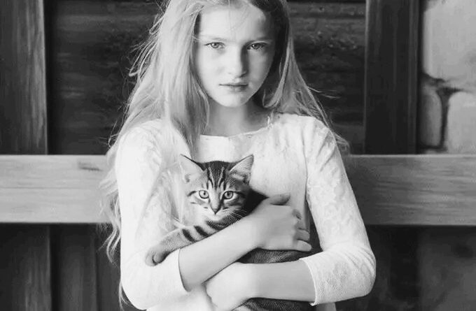 Поздний, прозрачный вечер стоял над деревней, укутывая крыши мягкой дымкой. Солнце, цепляясь за резные наличники старого дома, окрашивало их в медово-теплые оттенки. На завалинке, которая еще хранила дневное тепло, сидела тоненькая двенадцатилетняя девочка. В ладонях она бережно держала тощего серого котенка с непропорционально крупными ушами — единственное существо, которое не отталкивало ее.