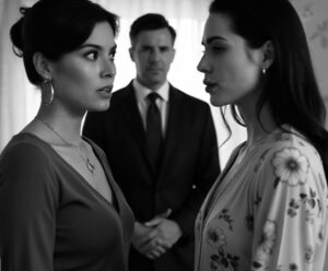 Андрей и Ирина вошли на кухню. Он взял чашку в руки, а она, словно случайно, коснулась плеча Веры. При этом взгляд Ирины скользнул по комнате, задержавшись на старой фотографии на стене — семейном портрете, где ещё молодой Михаил Петрович держит на руках Веру в детстве. На мгновение её лицо стало мягким, почти растерянным, но потом улыбка вновь сменилась холодом, и Вера почувствовала, как напряжение растет.