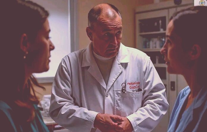В комнату вошёл врач — невысокий человек с усталыми глазами и строгим выражением. Он быстро подошёл к паре, оценивая обстановку, словно ища опору или ответы в пустых стенах палаты. «Как она?» — дрожащим голосом спросил мужчина.