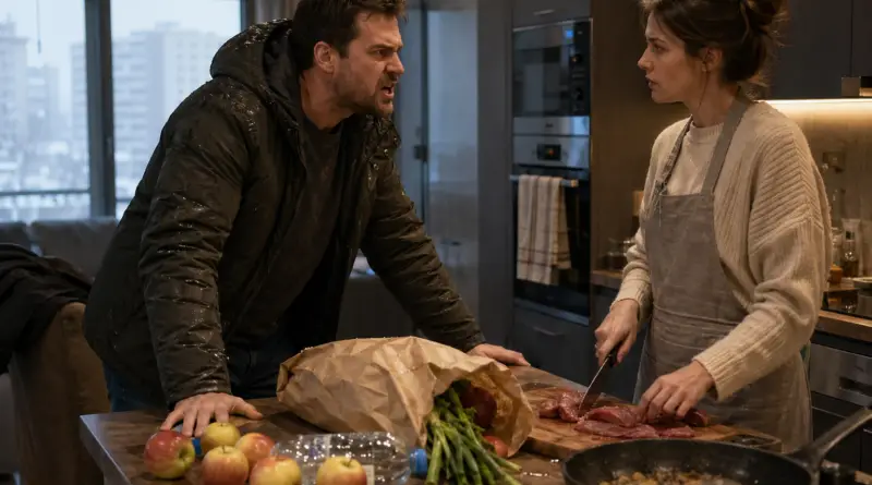 Олег с размаху швырнул тяжёлый пакет с продуктами на кухонный стол. Бумага не выдержала — лопнула по шву. Яблоки разлетелись по столешнице, бутылка воды опасно качнулась на краю, едва не упав. Одно яблоко всё же сорвалось вниз и закатилось под холодильник.