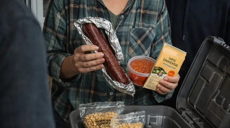 Я открыла его и увидела содержимое: палка сырокопчёной колбасы, та самая икра минтая, кусок дорогого сыра и две упаковки кедровых орехов.